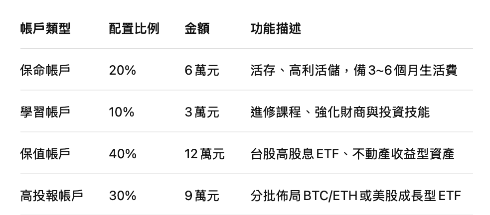 建議的實戰配置(假設你有 30 萬資金):